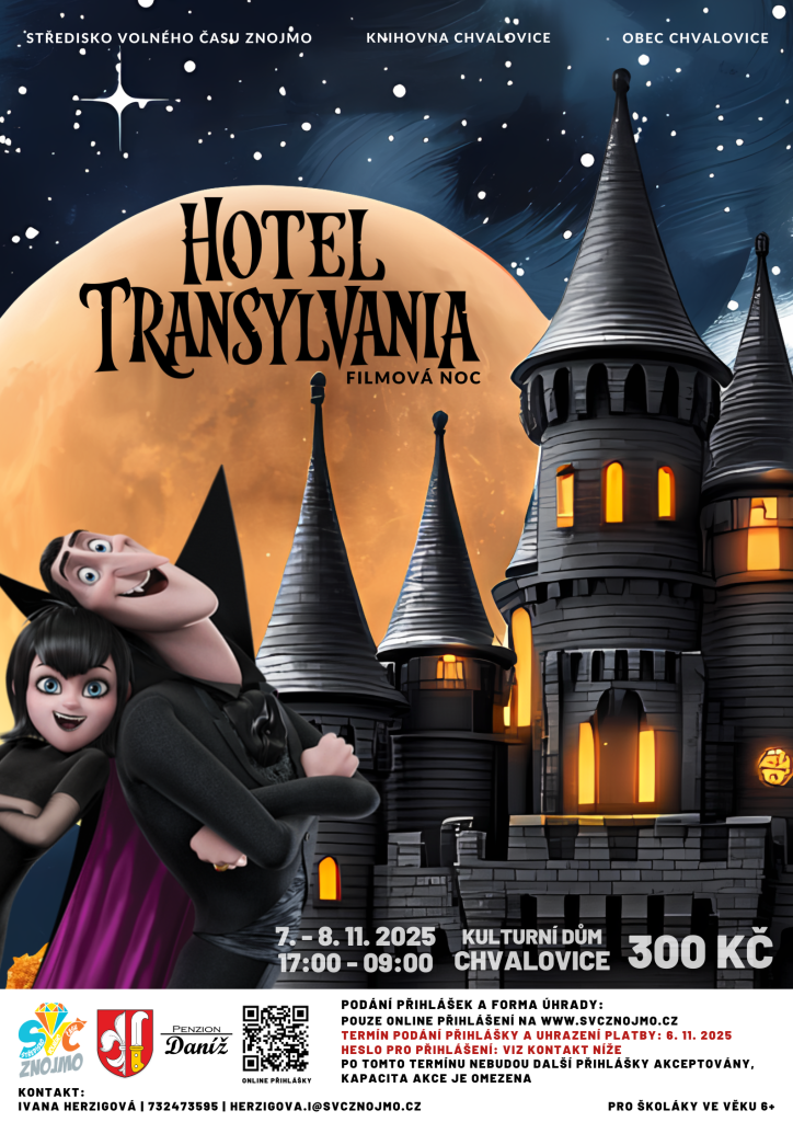 Zveme všechny školáky na filmovou noc s filmem Hotel Transylvánie, která se uskuteční v kulturním domě Chvalovice. Akce proběhne od 7. do 8. listopadu 2025, začíná v 17:00 a končí následující den v 09:00. Cena za účast na této akci je 300 Kč. Přihlášky je možné podávat pouze online na webových strán